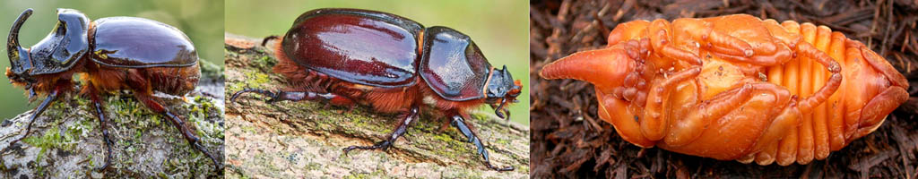 Самцы (слева на рис.) и самки (в центре) жука-носорога выносливы и к биопрепаратам, и к ядохимикатам; куколки (справа) еще более выносливы и хорошо замаскированы. Лет короткий, ночной; разнополые особи находят друг друга высоко в воздухе в полете, так что и на феромоны «не ведутся». Спарившись, самцы отправляются тихо умирать с сознанием выполненного долга (в это время их легко найти на земле), а самки, наскоро подкормившись, зарываются в землю, откладывают яйца и отправляются вслед своим спутникам жизни. Еще один идеальный вредитель? Но вспышки массового вреда от жука-носорога случаются редко и более по вине человека.