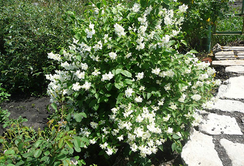 Чубушник неприхотлив не только в уходе, но и в соседстве. С ним уживаются многие многолетники и большинство однолетников. В зависимости от сорта и формы кроны вокруг куста могут быть насажены такие низкорослые культуры, как лапчатка, клетра ольхолистная, ладанник.