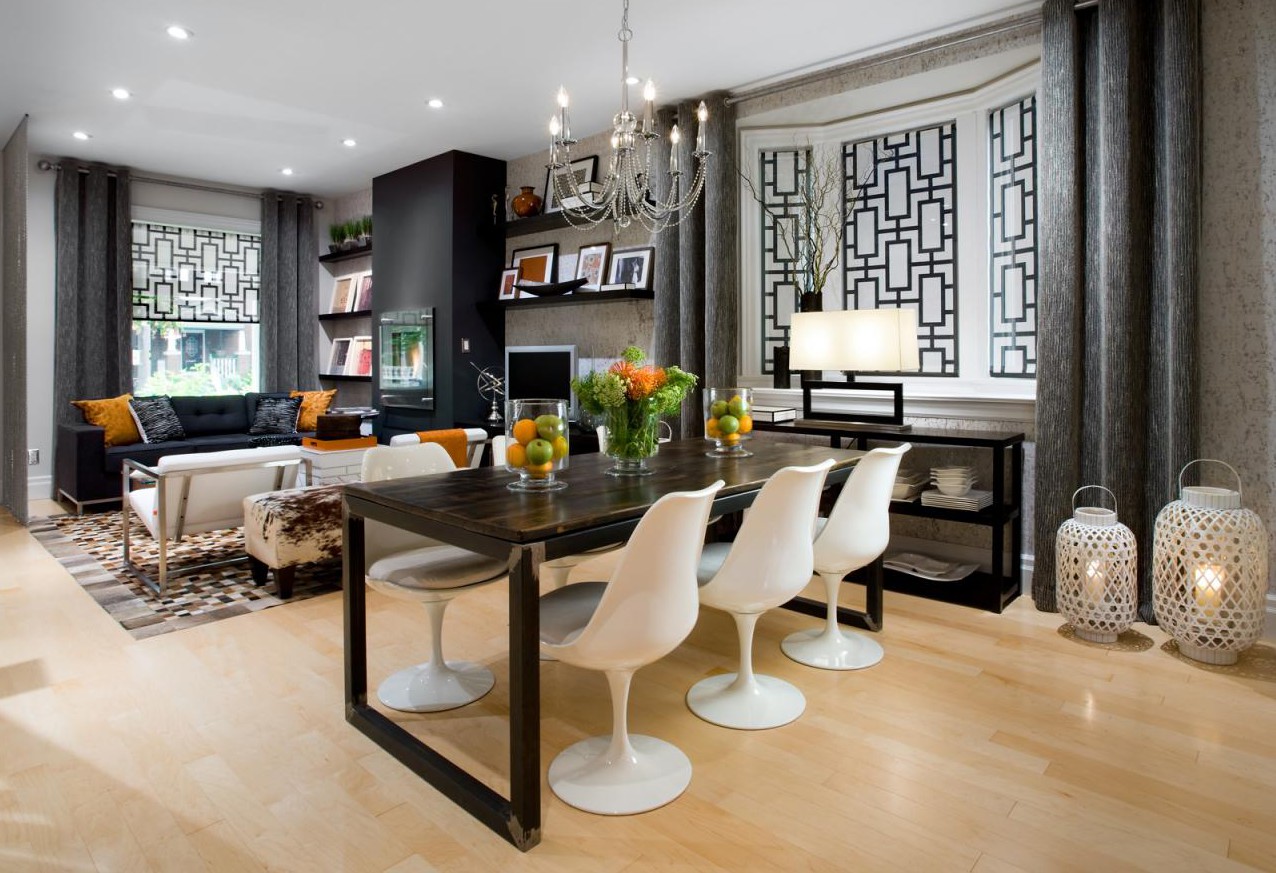 Еще одна цветовая схема, в которую хорошо вписываются темные полы - черно-белая . В интерьер, выполненный в этих цветах-антагонистах, вовсе необязательно включать ахроматическое напольное покрытие. Более того, именно цвет дерева будет здесь оптимален, поскольку он делает помещение уютнее и теплее. Светлое дерево может значительно упростить помещение, в то время как темные полы поддержат концепцию контрастности.