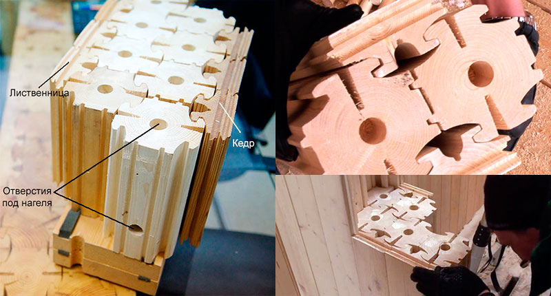 Соединение элементов происходит за счет нескольких соединений «паз-планка», что делает стену из вертикального бруса монолитной. Дополнительное крепление элементов осуществляется с помощью нагелей