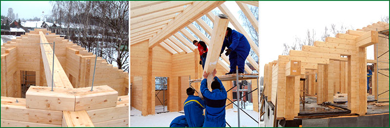 в сложной форме. При строительстве дома бревна из таких заготовок закрепляются вертикально. Эта технология сокращает усадочный период после завершения строительства.