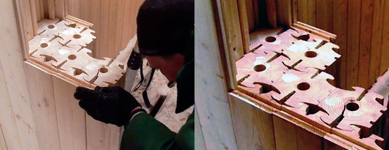 - Брус фрезеруется и сверлится под нагели согласно расчетным проектным вычислениям;