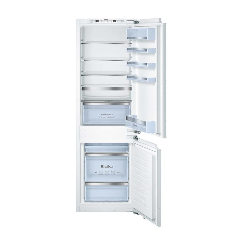 Встраиваемый двухкамерный холодильник с габаритами 55,8x55,4x177,2 см. Экономное потребление энергии обеспечивает класс А++ - всего 223 кВт в год. Морозильный отдел (68 л) оснащен системой No Frost, а холодильный (189 л) Direct cool - капельной. За сутки способен заморозить 8 кг продовольствия.