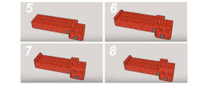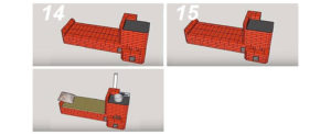 - Обустраивают нижний канал конструкции, при этом одну линию кирпичей укладывают поперёк, чтобы перекрыть топочную камеру. Блоки расставляют, оставляя вертикальный канал и проём топки открытыми;