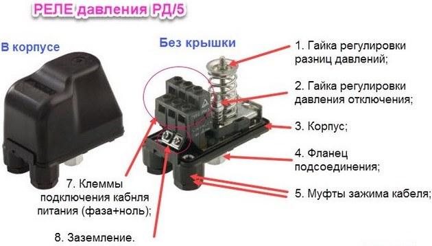 Реле следует грамотно подключить к электросети и к контактам насоса. Обязательное требование безопасности — наличие заземления прибора