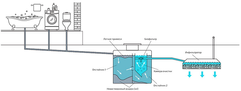 Септики с биологическими фильтрами считаются лучшими системами канализации в частном доме, где на постоянной основе проживают люди. Для переработки отходов применяются специальные микроорганизмы, которые выливаются в Ограничений в отношении такой канализации нет, лишь потребуется подключение к электрической сети.