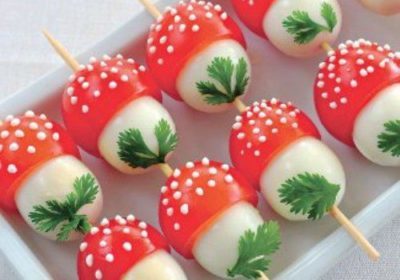 Для украшения блюда выложить на тарелку перышки зеленого лука и веточки укропа. Это блюдо простое и недорогое в приготовлении, но оригинально и нарядно смотрится на праздничном столе. Миниатюрная закуска для детей — грибочки и для взрослых — шашлычок!