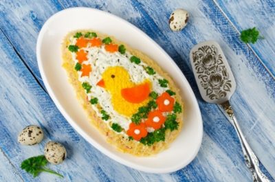 Аппетитный и нарядный салат «Цыпленок» украсит собой любой праздничный стол, особенно пасхальный или новогодний.