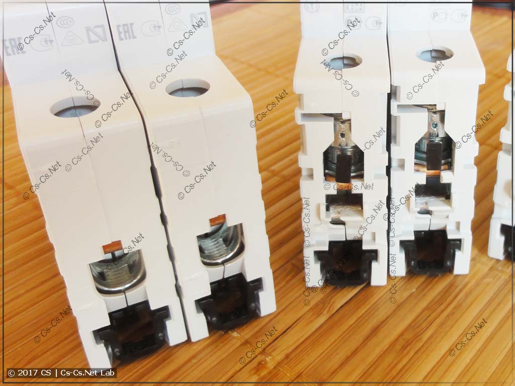 x/xx. Ещё тут нет индикатора состояния контактов (зелёно-красного флажка). Контакты тут одинарные и шлицы у них немного слабоватые. Сами контакты сделаны в виде U-образной скобочки, которая поджимает провод. Эти контакты очень любят гопники, которые обожают пихать по пять проводов в один автомат — такая форма контакта прижимает провода друг к другу, и они не вываливаются. Можно сказать, что эти контакты специально созданы для щитовиков-гопников.