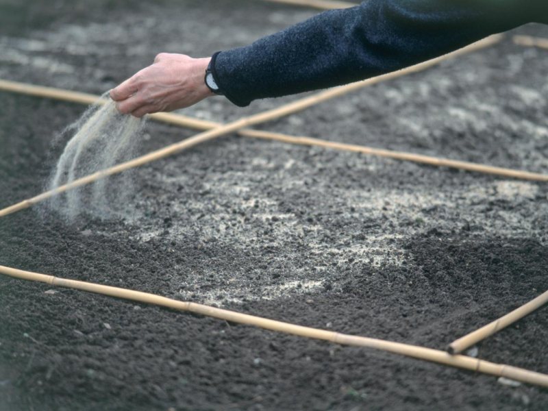- Затем стараются как можно равномернее рассыпать семена по участку: сначала вдоль; потом поперёк.