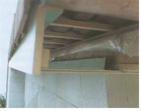 После того как монолитная крыша покрыта, нужно еще обшить свес крыши по фронтонному краю и у водосточного желоба. Деревянные брусья, между которыми находится теплоизоляция, должны выступать у водосточного желоба над фасадом. С боков свес крыши делается за счет свисающей обрешетки крыши. Вначале привинчивают снизу к планкам крыши ветровую доску, к которой уже прибита другая планка. К этой доске позднее привинчивают снизу дощечки для бокового свеса. Но пока дойдет до этого очередь, обшиваются деревянные брусья у водосточного желоба. Доски с шпунтами и пазами также пришиваются снизу. Спереди монтируется вентиляционная решетка, чтобы мог возникнуть воздушный поток, который выносит через конек крыши возникающий периодически конденсат (между теплоизоляцией и подложенной пленкой). Теперь крепко прибиваются дощечки по фронтонной ветровой доске.