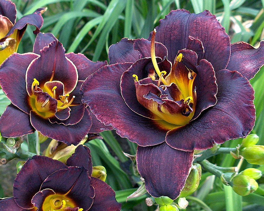 Особенно хороши «паукообразные» лилейники селекции Джеймса Госсарда. Кроме феноменальной устойчивости к сырости и холодам они обладают еще выдающимися декоративными качествами. Формы цветков необыкновенно красивы и разнообразны. Лепестки у многих свиваются в свое образные кудри, у других, напротив, сияют острыми яркими лучами, а у некоторых по краешку лепестка идет красивая волнистая гофрировка.
