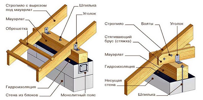 Крепится мауэрлат по-разному. В стену из кирпича закладывается стальная проволока ? 8-12 мм, в дереве сверлятся отверстия для проволоки, и через них брус привязывается к стене. Также брус можно закрепить скобами, резьбовыми шпильками в один или два зуба, металлическими пластинами, деревянными прибоинами или анкерами через те же отверстия в мауэрлате. Фронтоны и нижние края обрешетки крепятся или непосредственно к мауэрлату, или на брус меньшего сечения, который прибивается (прикручивается) к верхней обвязке.