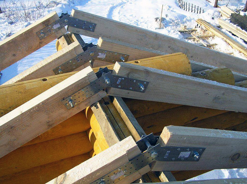 Верхние концы стропил можно скрепить несколькими способами : внахлест, встык и «в лапу», то есть, с вырезом пазов. Для фиксации используют металлические накладки или болты. Далее монтируют нижние и верхние затяжки, а затем готовые фермы поднимают наверх и устанавливают над перекрытиями.