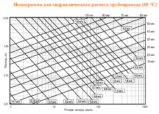 Например, расчет для полипропиленовых трубопроводов компании FIRAT существенно облегчается за счет приведенной номограммы, в которой указываются удельные потери давления или напора в трубопроводе для 1 метра погонного трубы. Анализ номограммы позволяет четко проследить обозначенные выше взаимосвязи между отдельными характеристиками. В этом и состоит основная суть гидравлических расчетов.